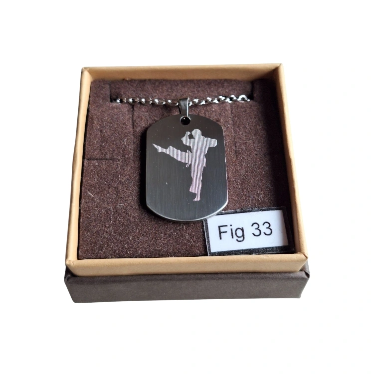 Scopri la Collana KARATE FIG 33 in acciaio inossidabile, un accessorio perfetto per chi ama il karate e vuole mostrare la propria passione con stile. Leggera e resistente, è ideale per ogni occasione, dal training alle uscite con gli amici. Fatti notare con un tocco di eleganza!
