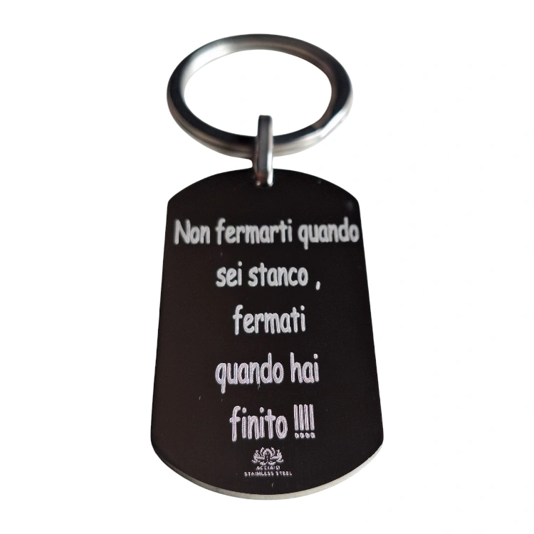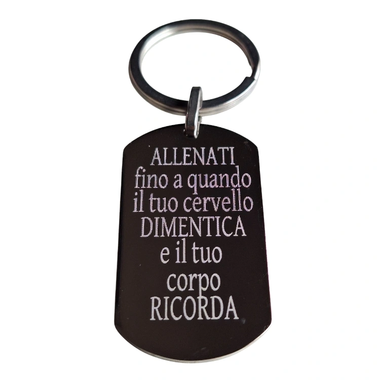 Questo portachiavi in acciaio inox inciso è dedicato a chi non si arrende mai, a chi vive per superare i propri limiti, allenamento dopo allenamento.
